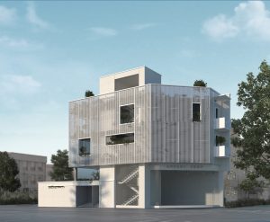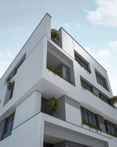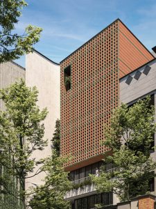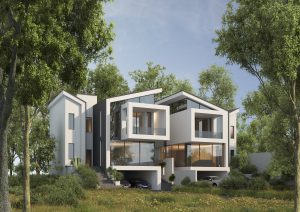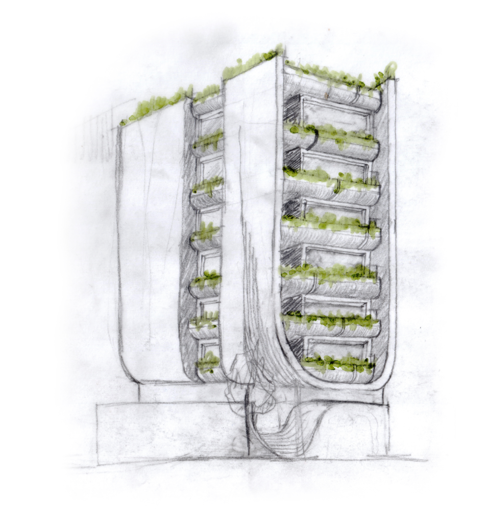طرح مفهومی یک ساختمان مدرن با ساختار باز، سطوح معلق، فضای سبز یکپارچه